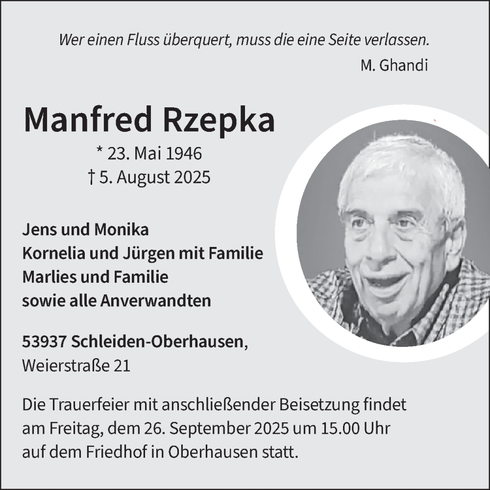 Hier finden Sie alle Traueranzeigen aus der Zeitung, die bisher für Manfred Rzepka erschienen sind. Weitere Traueranzeigen, die in der Zeitung erscheinen, werden hier ebenfalls aufgelistet