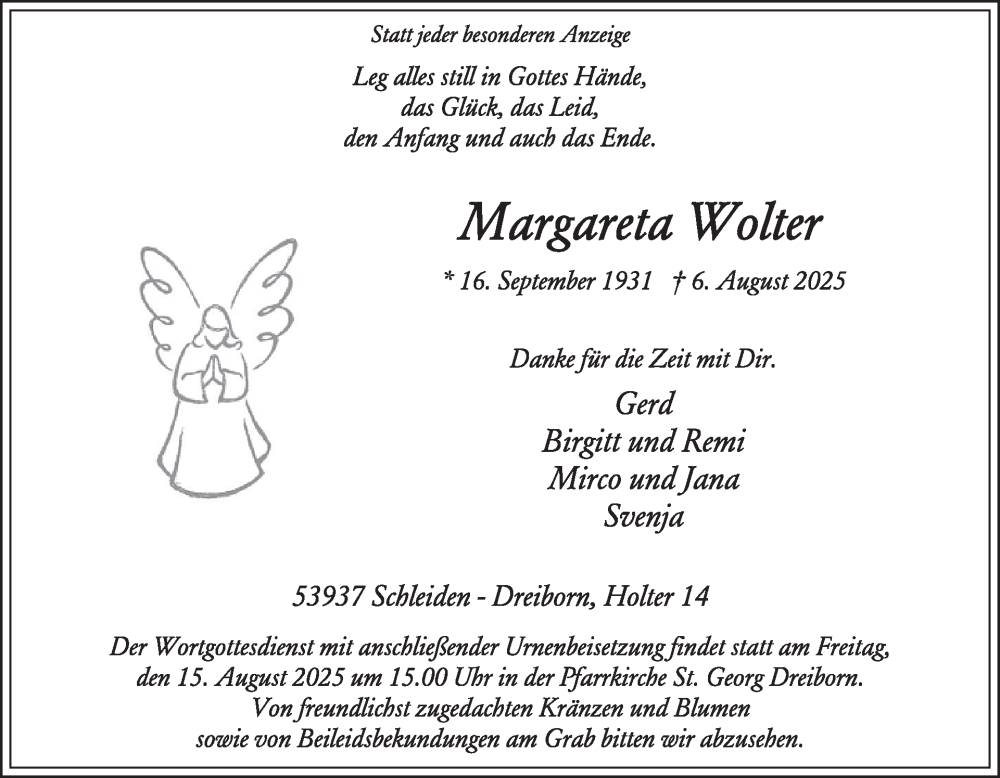 Hier finden Sie alle Traueranzeigen aus der Zeitung, die bisher für Margareta Wolter erschienen sind. Weitere Traueranzeigen, die in der Zeitung erscheinen, werden hier ebenfalls aufgelistet