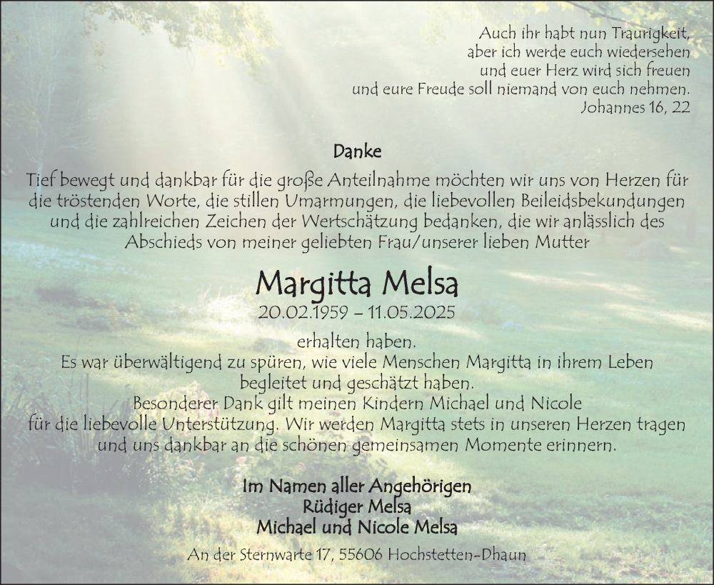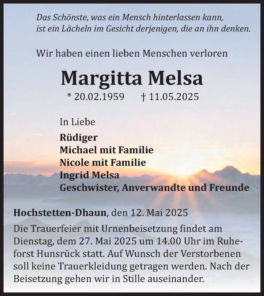 Hier finden Sie alle Traueranzeigen aus der Zeitung, die bisher für Margitta Melsa erschienen sind. Weitere Traueranzeigen, die in der Zeitung erscheinen, werden hier ebenfalls aufgelistet