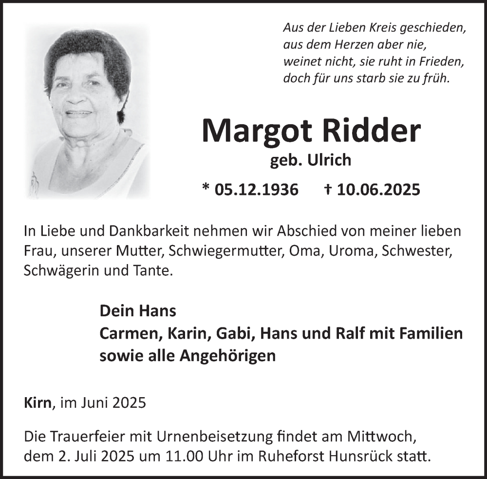 Hier finden Sie alle Traueranzeigen aus der Zeitung, die bisher für Margot Ridder erschienen sind. Weitere Traueranzeigen, die in der Zeitung erscheinen, werden hier ebenfalls aufgelistet