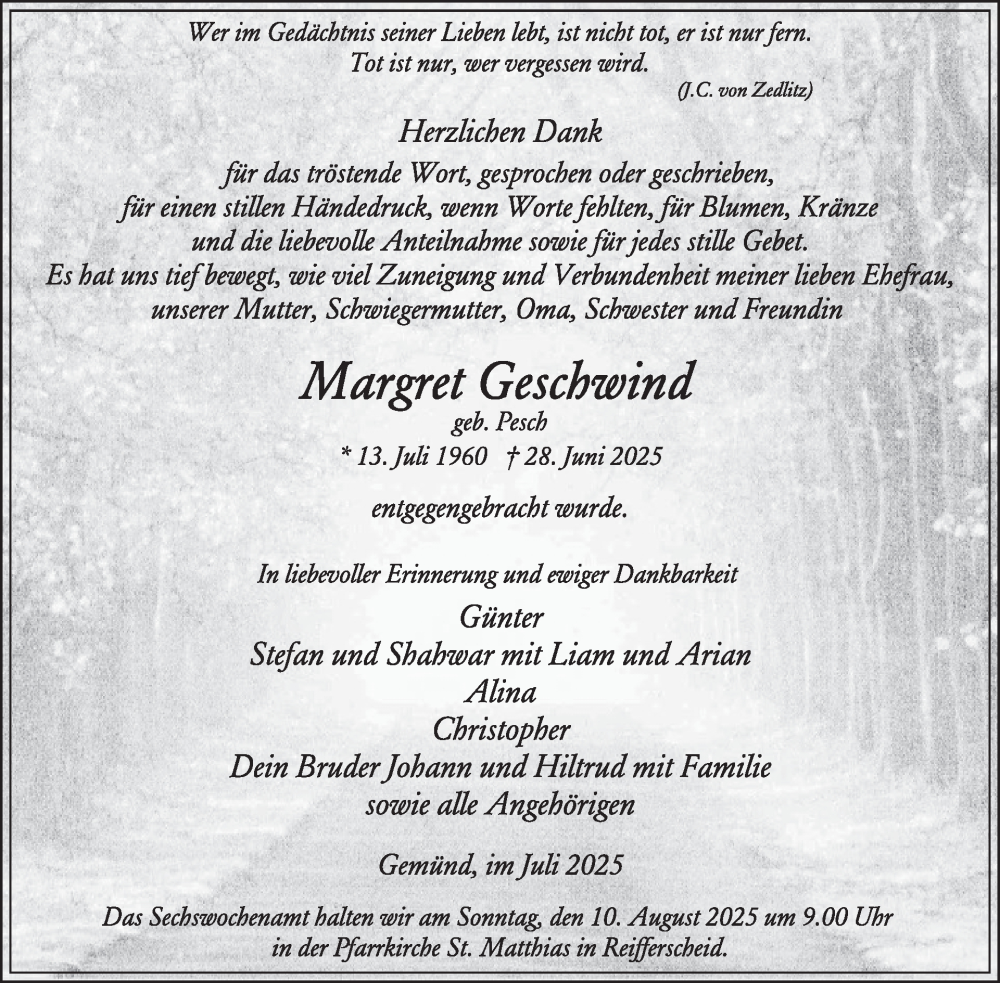 Hier finden Sie alle Traueranzeigen aus der Zeitung, die bisher für Margret Geschwind erschienen sind. Weitere Traueranzeigen, die in der Zeitung erscheinen, werden hier ebenfalls aufgelistet