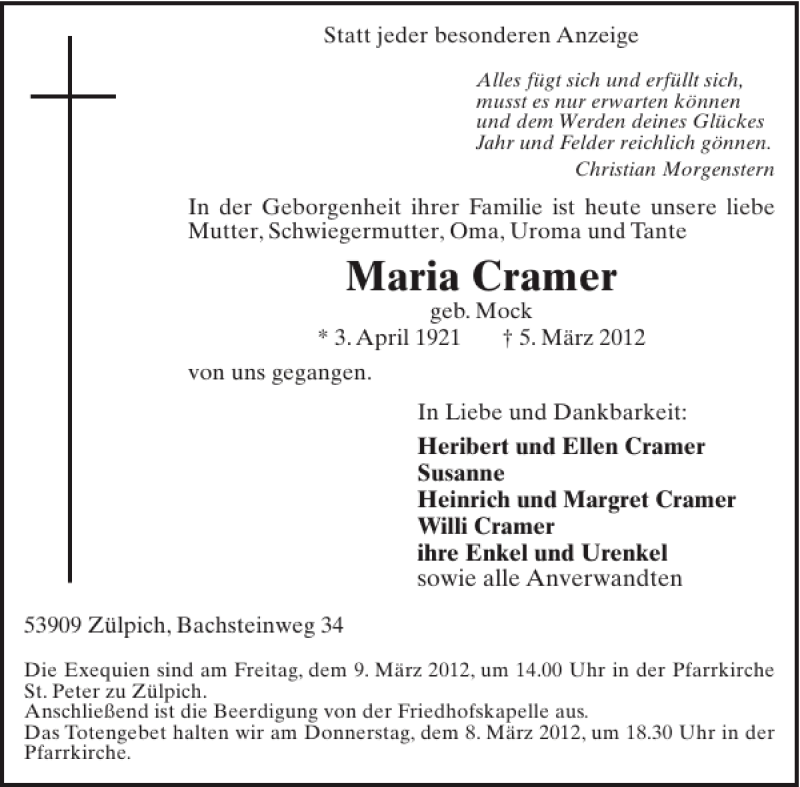 Hier finden Sie alle Traueranzeigen aus der Zeitung, die bisher für Maria Cramer erschienen sind. Weitere Traueranzeigen, die in der Zeitung erscheinen, werden hier ebenfalls aufgelistet