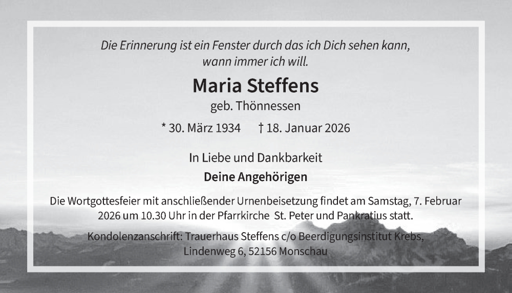 Hier finden Sie alle Traueranzeigen aus der Zeitung, die bisher für Maria Steffens erschienen sind. Weitere Traueranzeigen, die in der Zeitung erscheinen, werden hier ebenfalls aufgelistet