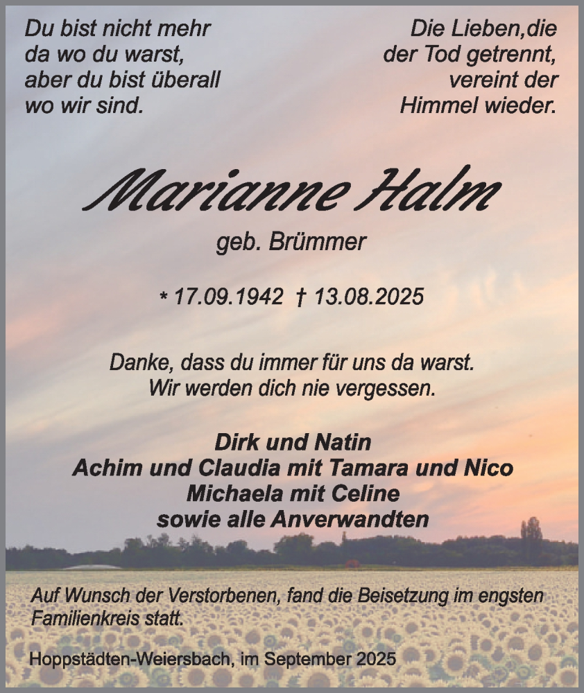 Hier finden Sie alle Traueranzeigen aus der Zeitung, die bisher für Marianne Halm erschienen sind. Weitere Traueranzeigen, die in der Zeitung erscheinen, werden hier ebenfalls aufgelistet