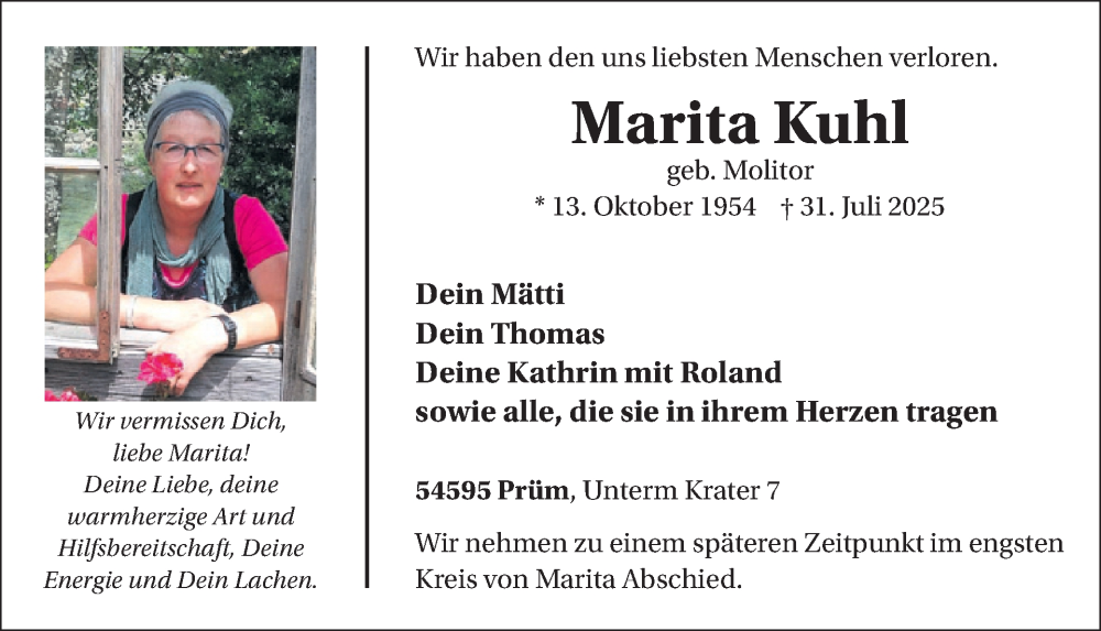 Hier finden Sie alle Traueranzeigen aus der Zeitung, die bisher für Marita Kuhl erschienen sind. Weitere Traueranzeigen, die in der Zeitung erscheinen, werden hier ebenfalls aufgelistet