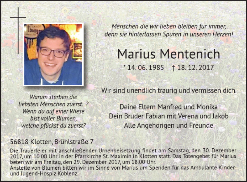Hier finden Sie alle Traueranzeigen aus der Zeitung, die bisher für Marius Mentenich erschienen sind. Weitere Traueranzeigen, die in der Zeitung erscheinen, werden hier ebenfalls aufgelistet