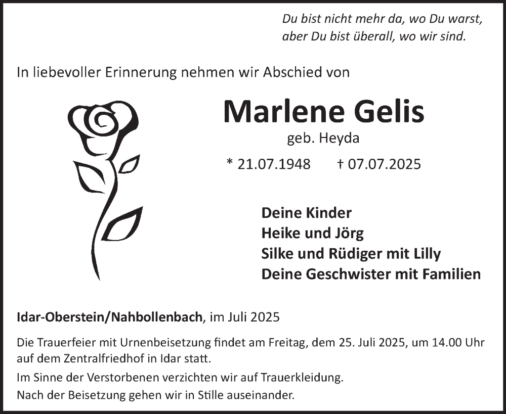 Hier finden Sie alle Traueranzeigen aus der Zeitung, die bisher für Marlene Gelis erschienen sind. Weitere Traueranzeigen, die in der Zeitung erscheinen, werden hier ebenfalls aufgelistet