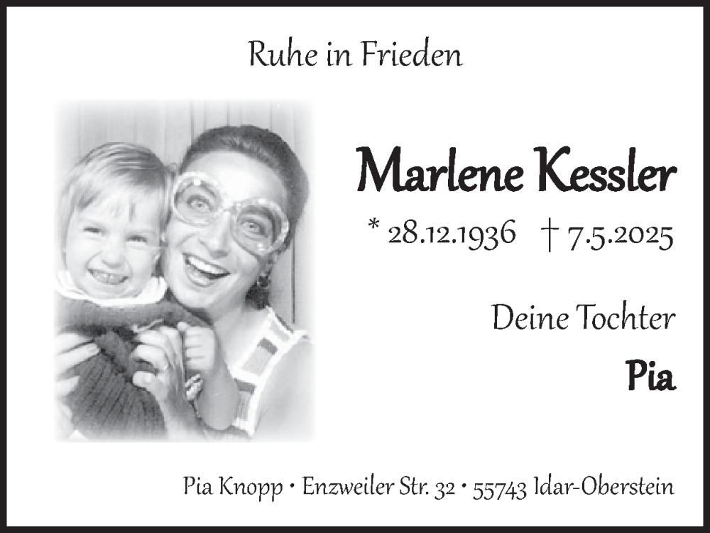 Hier finden Sie alle Traueranzeigen aus der Zeitung, die bisher für Marlene Kessler erschienen sind. Weitere Traueranzeigen, die in der Zeitung erscheinen, werden hier ebenfalls aufgelistet