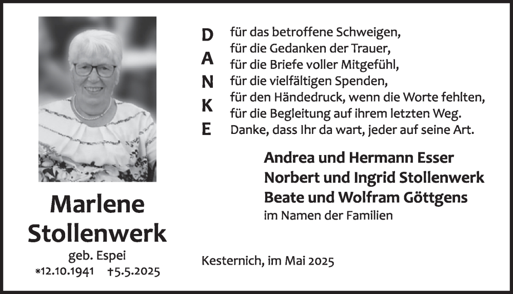 Hier finden Sie alle Traueranzeigen aus der Zeitung, die bisher für Marlene Stollenwerk erschienen sind. Weitere Traueranzeigen, die in der Zeitung erscheinen, werden hier ebenfalls aufgelistet