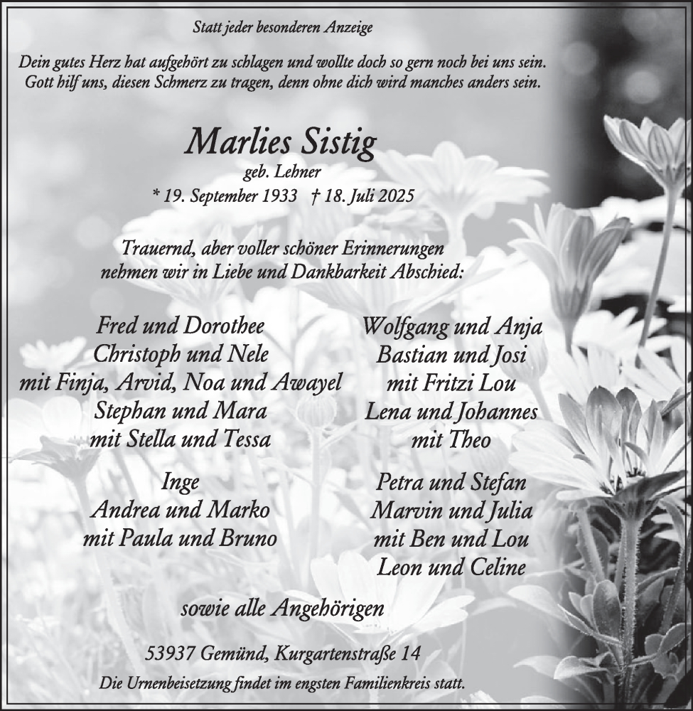 Hier finden Sie alle Traueranzeigen aus der Zeitung, die bisher für Marlies Sistig erschienen sind. Weitere Traueranzeigen, die in der Zeitung erscheinen, werden hier ebenfalls aufgelistet