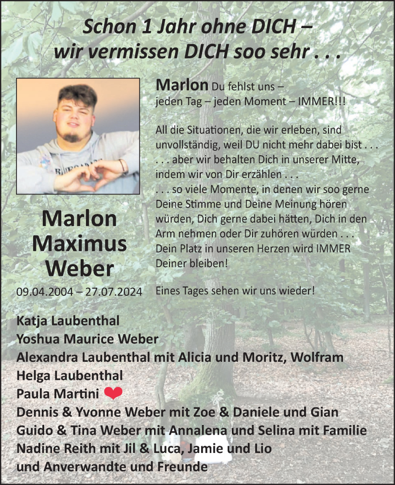 Hier finden Sie alle Traueranzeigen aus der Zeitung, die bisher für Marlon Maximus Weber erschienen sind. Weitere Traueranzeigen, die in der Zeitung erscheinen, werden hier ebenfalls aufgelistet