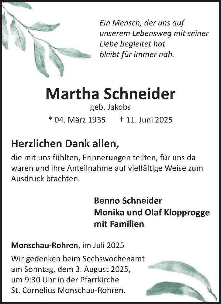 Hier finden Sie alle Traueranzeigen aus der Zeitung, die bisher für Martha Schneider erschienen sind. Weitere Traueranzeigen, die in der Zeitung erscheinen, werden hier ebenfalls aufgelistet