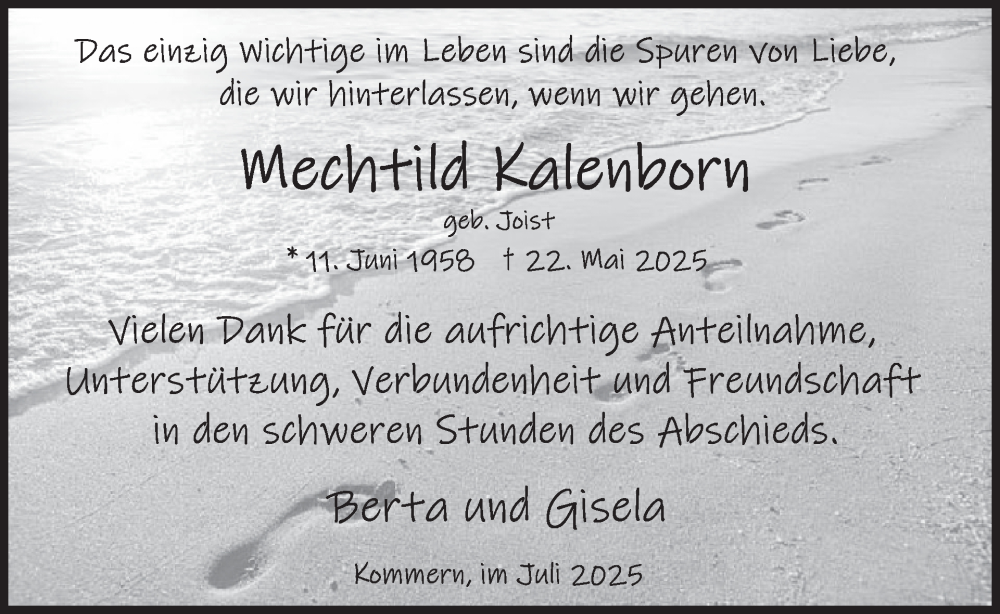 Hier finden Sie alle Traueranzeigen aus der Zeitung, die bisher für Mechtild Kaleborn erschienen sind. Weitere Traueranzeigen, die in der Zeitung erscheinen, werden hier ebenfalls aufgelistet
