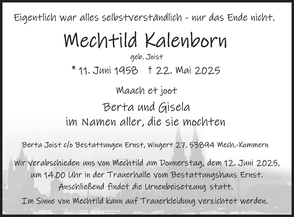 Hier finden Sie alle Traueranzeigen aus der Zeitung, die bisher für Mechtild Kalenborn erschienen sind. Weitere Traueranzeigen, die in der Zeitung erscheinen, werden hier ebenfalls aufgelistet