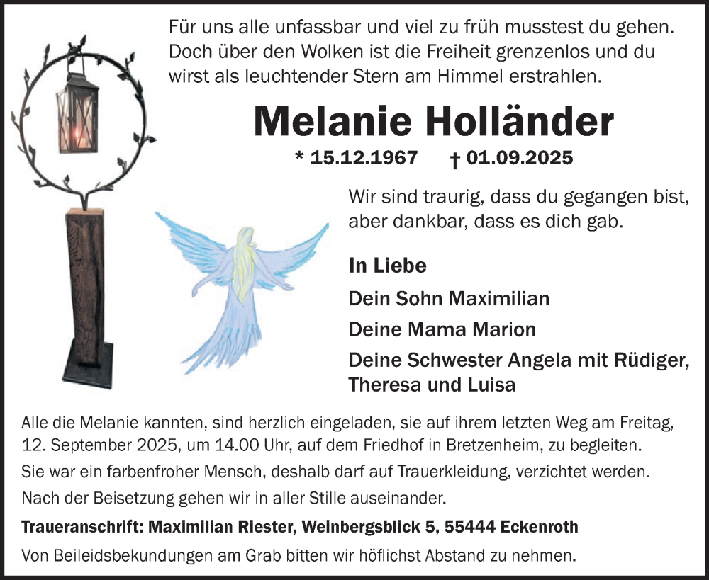Hier finden Sie alle Traueranzeigen aus der Zeitung, die bisher für Melanie Holländer erschienen sind. Weitere Traueranzeigen, die in der Zeitung erscheinen, werden hier ebenfalls aufgelistet