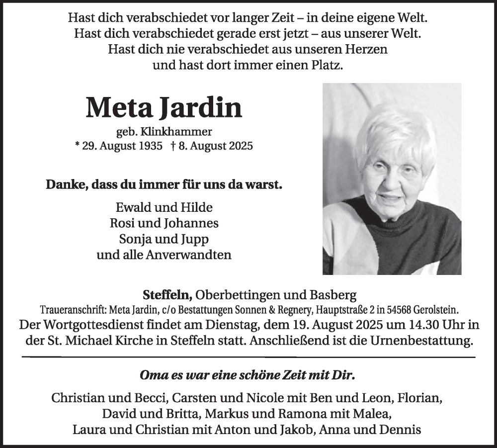 Hier finden Sie alle Traueranzeigen aus der Zeitung, die bisher für Meta Jardin erschienen sind. Weitere Traueranzeigen, die in der Zeitung erscheinen, werden hier ebenfalls aufgelistet