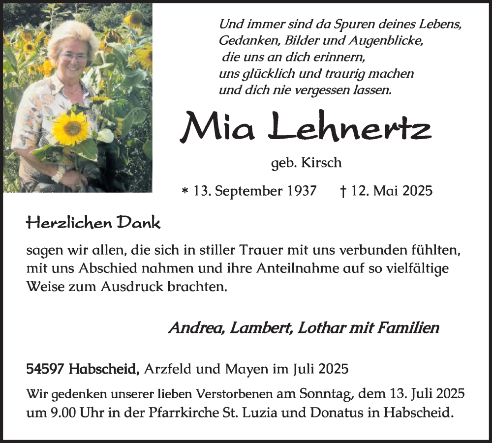 Hier finden Sie alle Traueranzeigen aus der Zeitung, die bisher für Mia Lehnertz erschienen sind. Weitere Traueranzeigen, die in der Zeitung erscheinen, werden hier ebenfalls aufgelistet