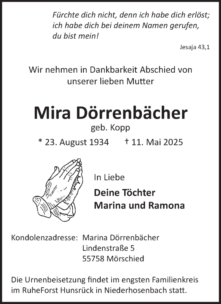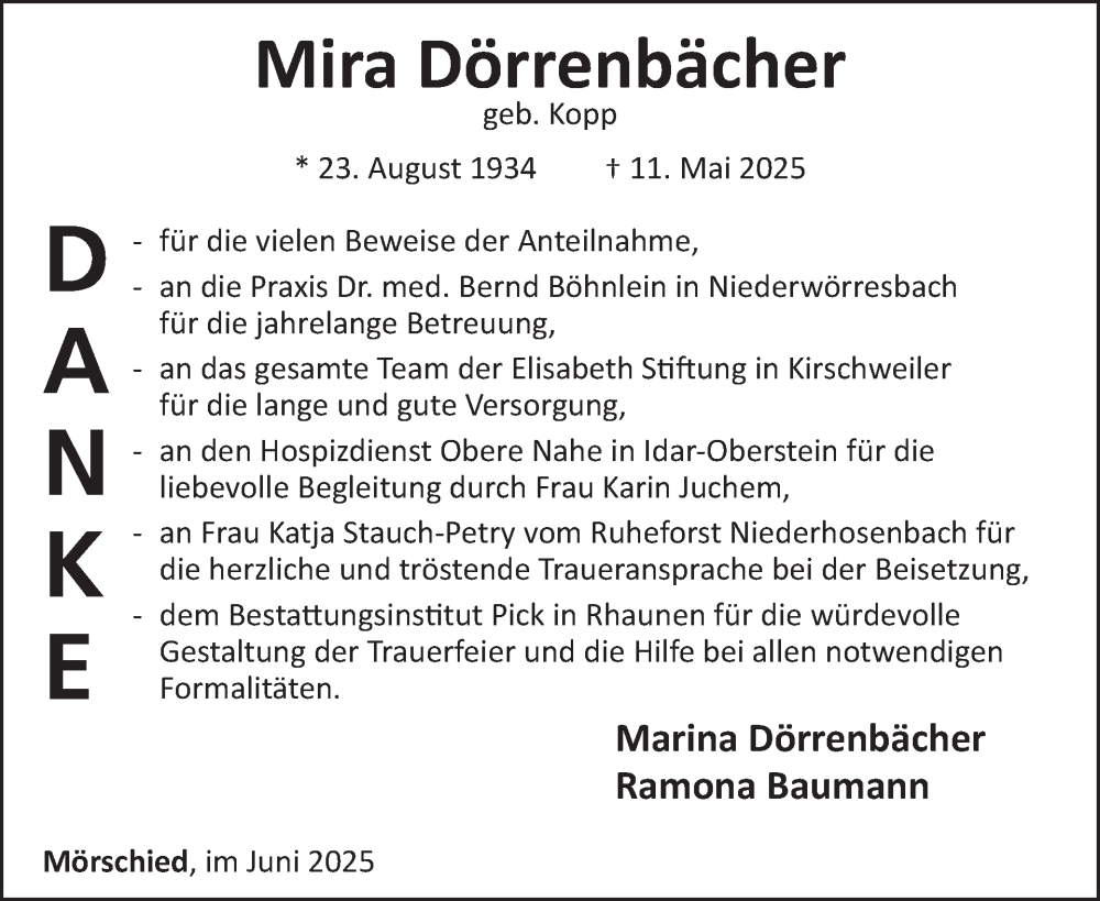 Hier finden Sie alle Traueranzeigen aus der Zeitung, die bisher für Mira Dörrenbächer erschienen sind. Weitere Traueranzeigen, die in der Zeitung erscheinen, werden hier ebenfalls aufgelistet