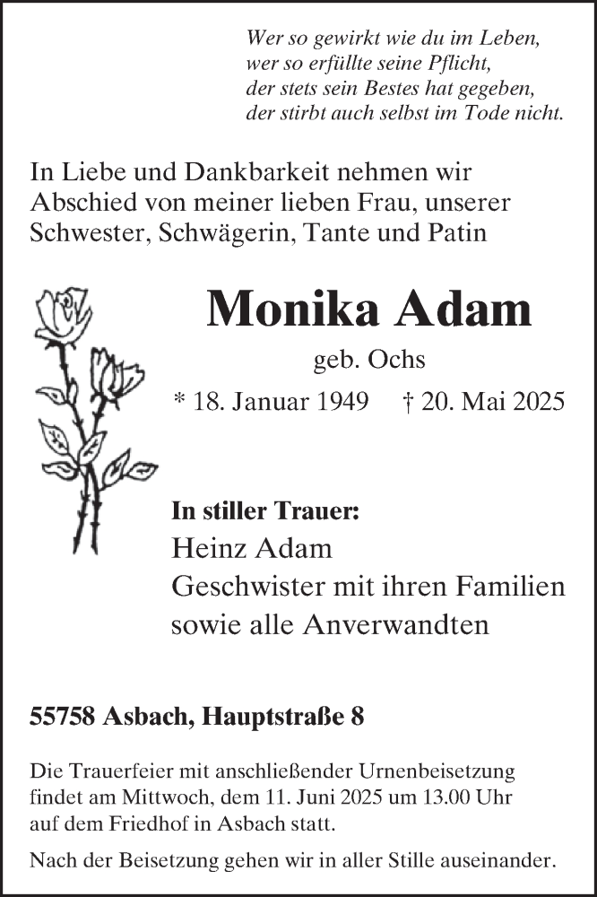 Hier finden Sie alle Traueranzeigen aus der Zeitung, die bisher für Monika Adam erschienen sind. Weitere Traueranzeigen, die in der Zeitung erscheinen, werden hier ebenfalls aufgelistet