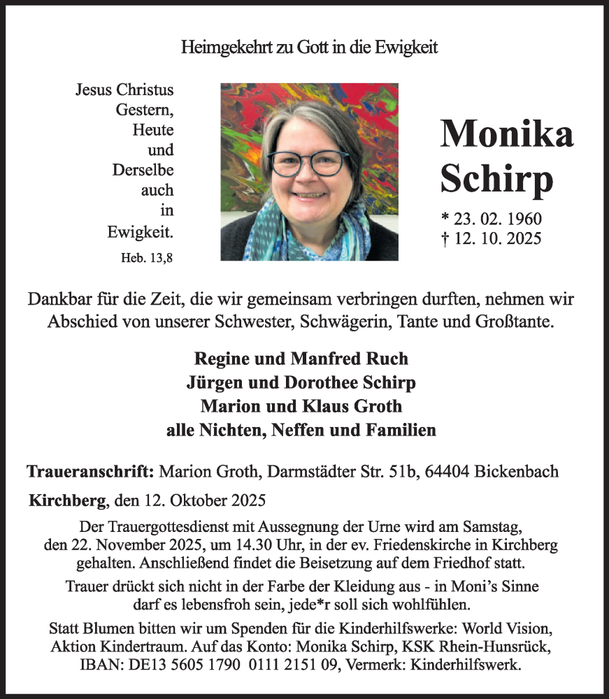 Hier finden Sie alle Traueranzeigen aus der Zeitung, die bisher für Monika Schirp erschienen sind. Weitere Traueranzeigen, die in der Zeitung erscheinen, werden hier ebenfalls aufgelistet