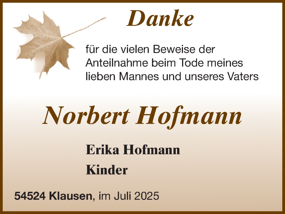 Hier finden Sie alle Traueranzeigen aus der Zeitung, die bisher für Norbert Hofmann erschienen sind. Weitere Traueranzeigen, die in der Zeitung erscheinen, werden hier ebenfalls aufgelistet