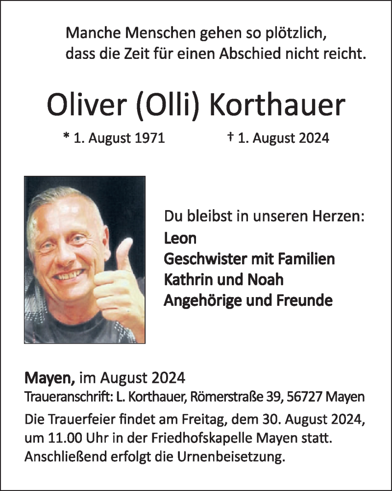 Hier finden Sie alle Traueranzeigen aus der Zeitung, die bisher für Oliver Korthauer erschienen sind. Weitere Traueranzeigen, die in der Zeitung erscheinen, werden hier ebenfalls aufgelistet
