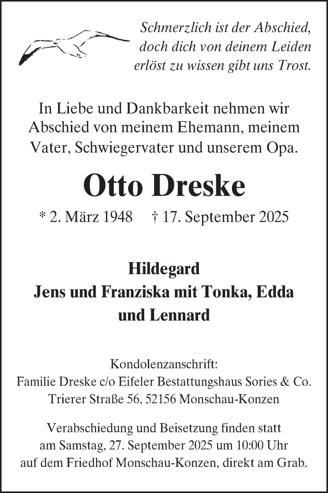 Hier finden Sie alle Traueranzeigen aus der Zeitung, die bisher für Otto Dreske erschienen sind. Weitere Traueranzeigen, die in der Zeitung erscheinen, werden hier ebenfalls aufgelistet