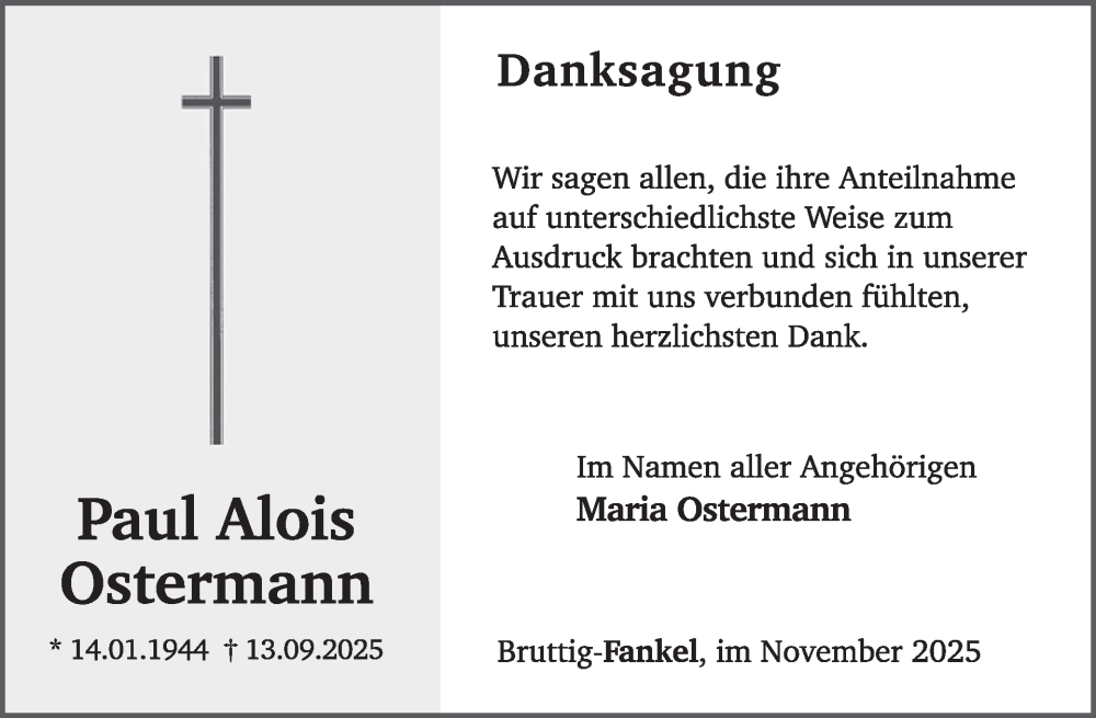 Hier finden Sie alle Traueranzeigen aus der Zeitung, die bisher für Paul Alois Ostermann erschienen sind. Weitere Traueranzeigen, die in der Zeitung erscheinen, werden hier ebenfalls aufgelistet