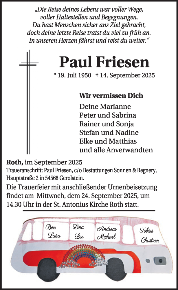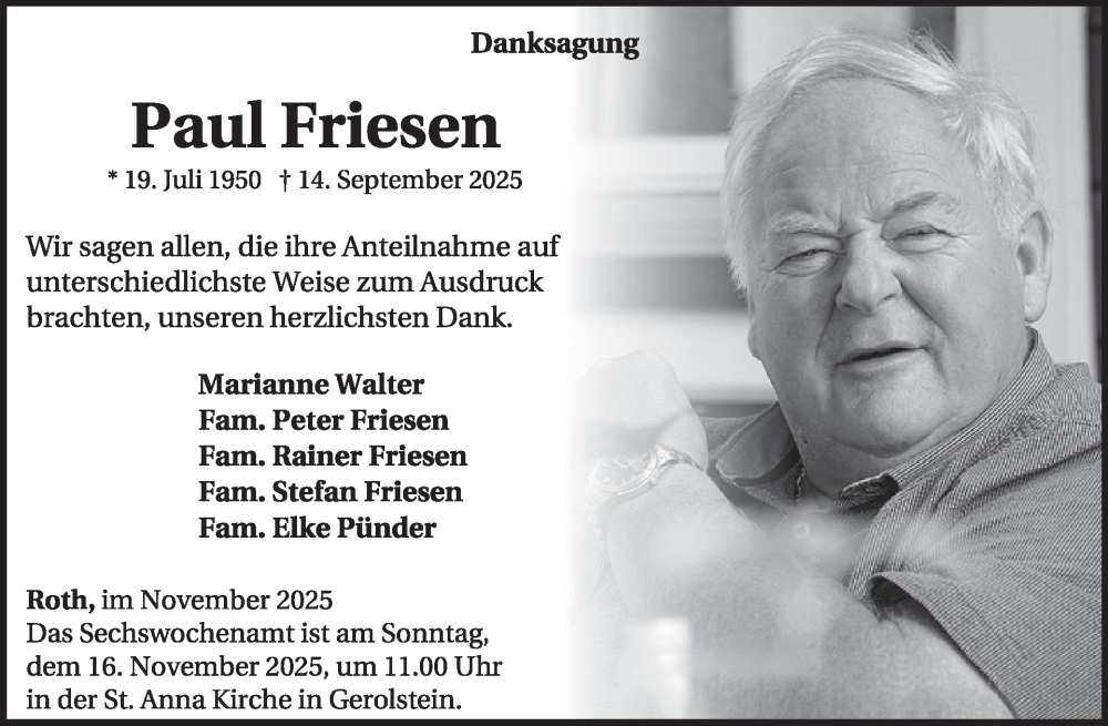 Hier finden Sie alle Traueranzeigen aus der Zeitung, die bisher für Paul Friesen erschienen sind. Weitere Traueranzeigen, die in der Zeitung erscheinen, werden hier ebenfalls aufgelistet