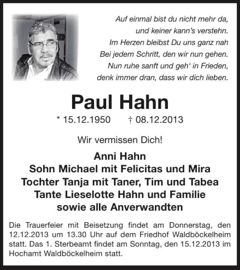 Hier finden Sie alle Traueranzeigen aus der Zeitung, die bisher für Paul Hahn erschienen sind. Weitere Traueranzeigen, die in der Zeitung erscheinen, werden hier ebenfalls aufgelistet