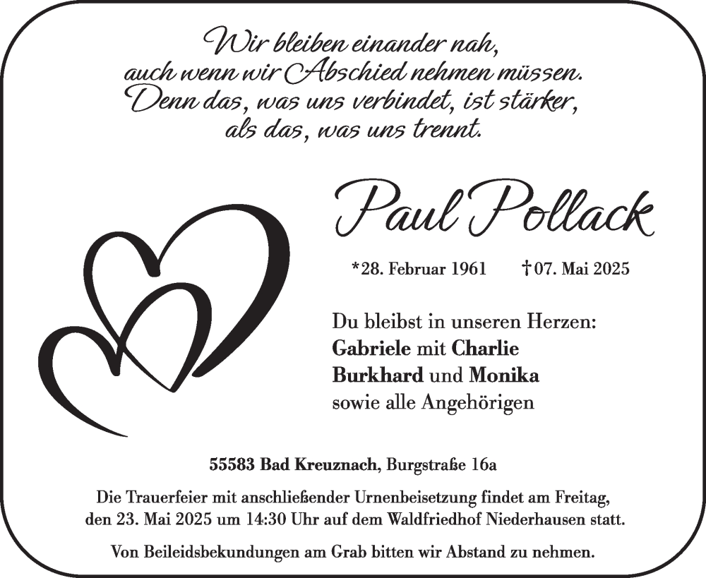 Hier finden Sie alle Traueranzeigen aus der Zeitung, die bisher für Paul Pollack erschienen sind. Weitere Traueranzeigen, die in der Zeitung erscheinen, werden hier ebenfalls aufgelistet