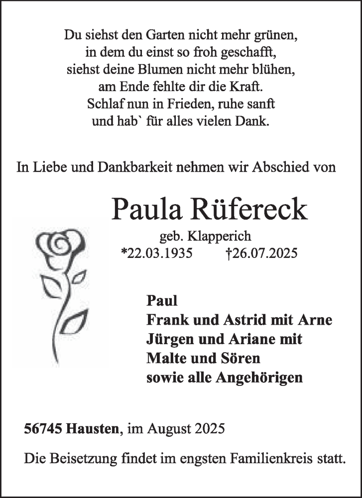 Hier finden Sie alle Traueranzeigen aus der Zeitung, die bisher für Paula Rüfereck erschienen sind. Weitere Traueranzeigen, die in der Zeitung erscheinen, werden hier ebenfalls aufgelistet