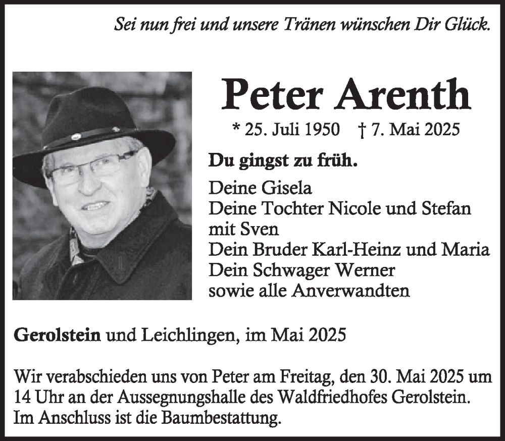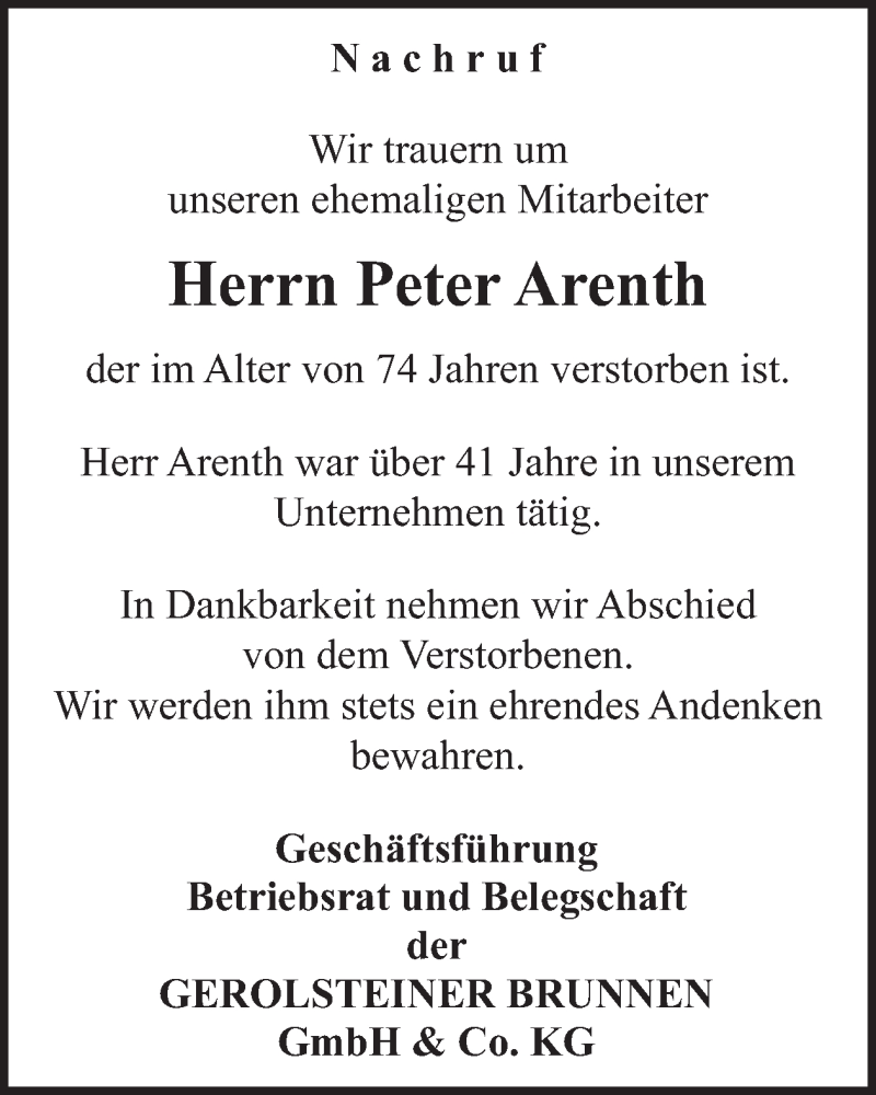 Hier finden Sie alle Traueranzeigen aus der Zeitung, die bisher für Peter Arenth erschienen sind. Weitere Traueranzeigen, die in der Zeitung erscheinen, werden hier ebenfalls aufgelistet