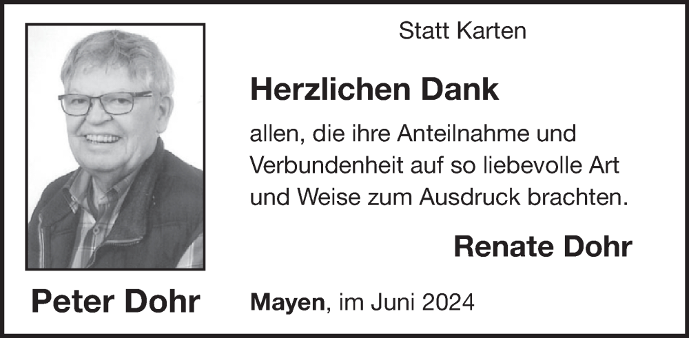 Hier finden Sie alle Traueranzeigen aus der Zeitung, die bisher für Peter Dohr erschienen sind. Weitere Traueranzeigen, die in der Zeitung erscheinen, werden hier ebenfalls aufgelistet