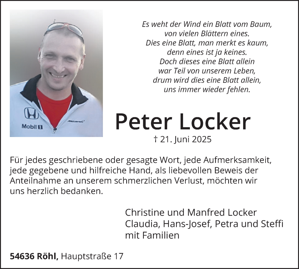Hier finden Sie alle Traueranzeigen aus der Zeitung, die bisher für Peter Locker erschienen sind. Weitere Traueranzeigen, die in der Zeitung erscheinen, werden hier ebenfalls aufgelistet