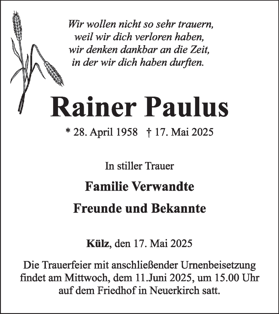 Hier finden Sie alle Traueranzeigen aus der Zeitung, die bisher für Rainer Paulus erschienen sind. Weitere Traueranzeigen, die in der Zeitung erscheinen, werden hier ebenfalls aufgelistet