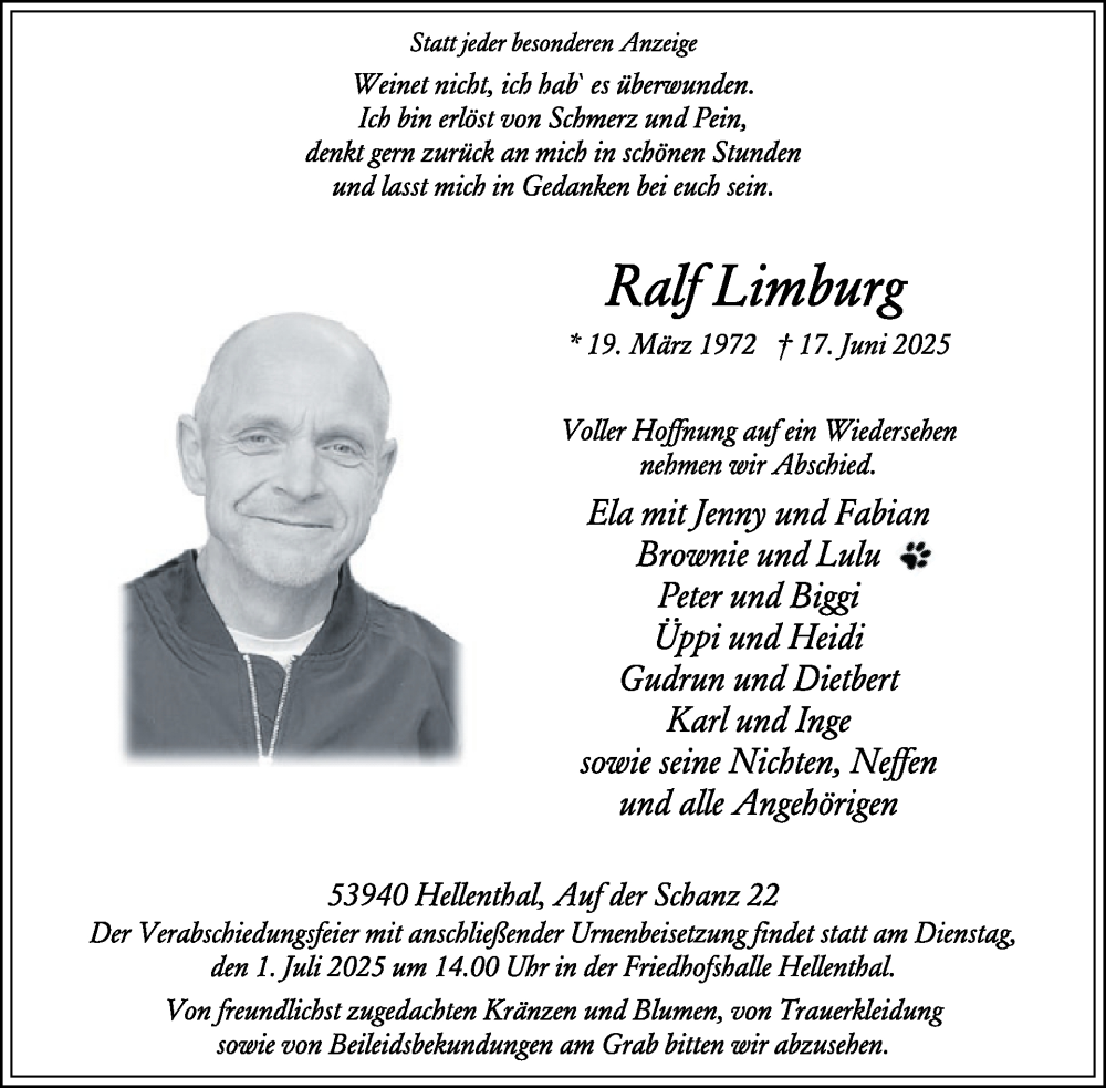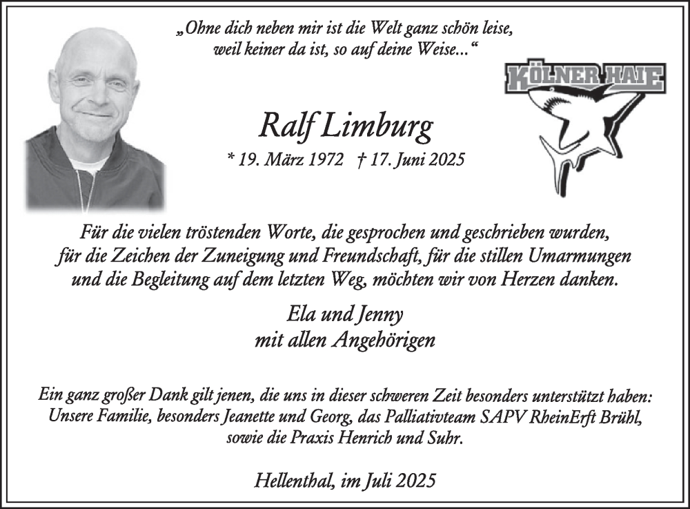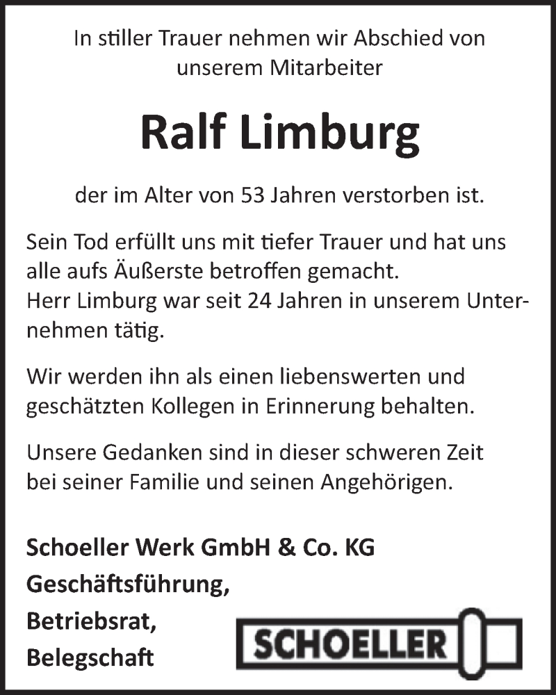 Hier finden Sie alle Traueranzeigen aus der Zeitung, die bisher für Ralf Limburg erschienen sind. Weitere Traueranzeigen, die in der Zeitung erscheinen, werden hier ebenfalls aufgelistet