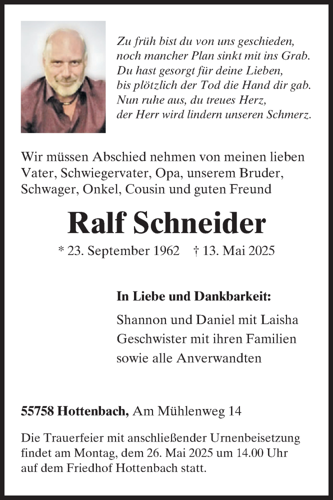 Hier finden Sie alle Traueranzeigen aus der Zeitung, die bisher für Ralf Schneider erschienen sind. Weitere Traueranzeigen, die in der Zeitung erscheinen, werden hier ebenfalls aufgelistet