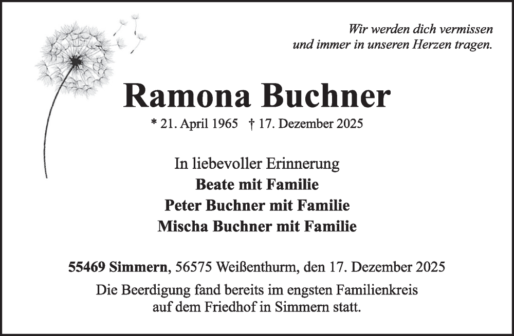 Hier finden Sie alle Traueranzeigen aus der Zeitung, die bisher für Ramona Buchner erschienen sind. Weitere Traueranzeigen, die in der Zeitung erscheinen, werden hier ebenfalls aufgelistet