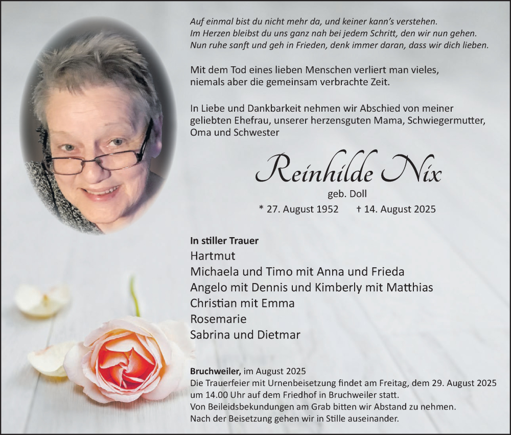 Hier finden Sie alle Traueranzeigen aus der Zeitung, die bisher für Reinhilde Nix erschienen sind. Weitere Traueranzeigen, die in der Zeitung erscheinen, werden hier ebenfalls aufgelistet
