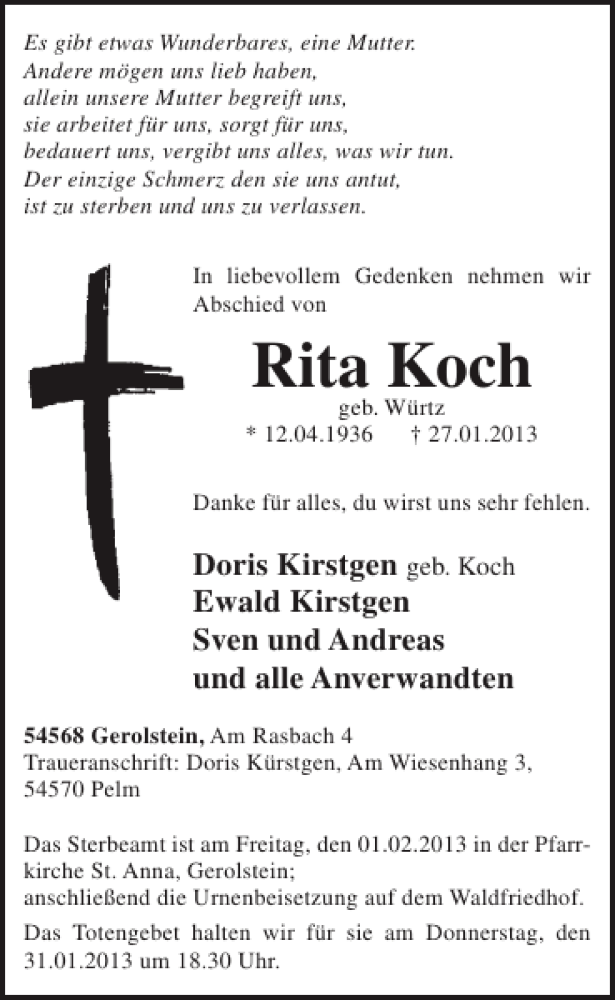 Hier finden Sie alle Traueranzeigen aus der Zeitung, die bisher für Rita Koch erschienen sind. Weitere Traueranzeigen, die in der Zeitung erscheinen, werden hier ebenfalls aufgelistet