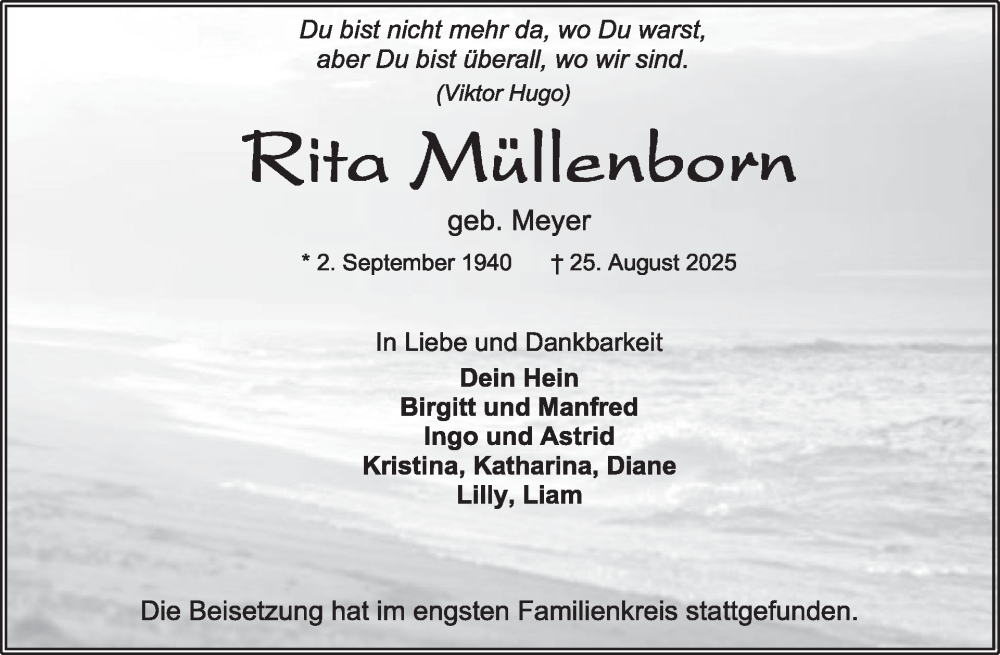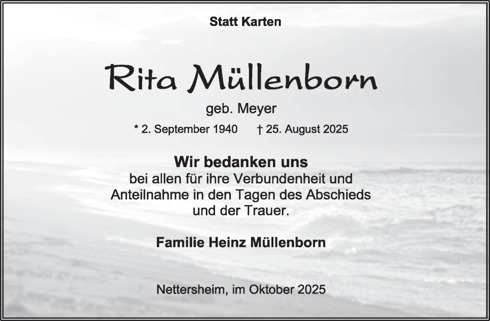 Hier finden Sie alle Traueranzeigen aus der Zeitung, die bisher für Rita Müllenborn erschienen sind. Weitere Traueranzeigen, die in der Zeitung erscheinen, werden hier ebenfalls aufgelistet