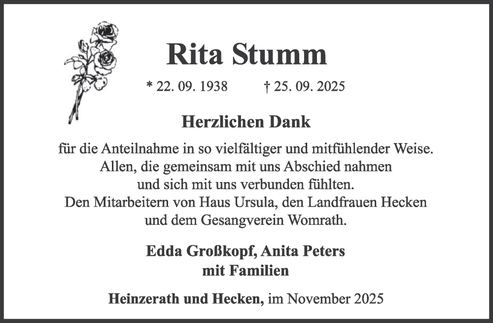 Hier finden Sie alle Traueranzeigen aus der Zeitung, die bisher für Rita Stumm erschienen sind. Weitere Traueranzeigen, die in der Zeitung erscheinen, werden hier ebenfalls aufgelistet