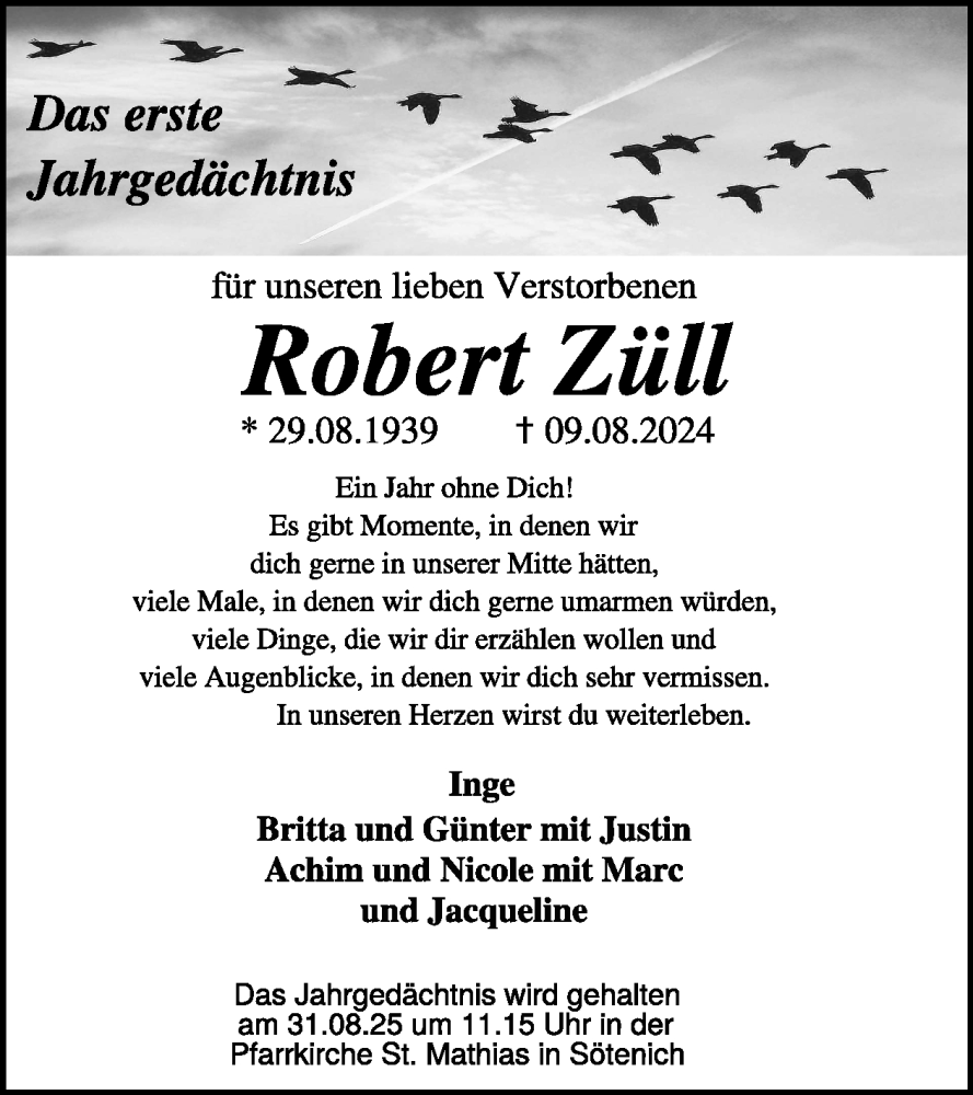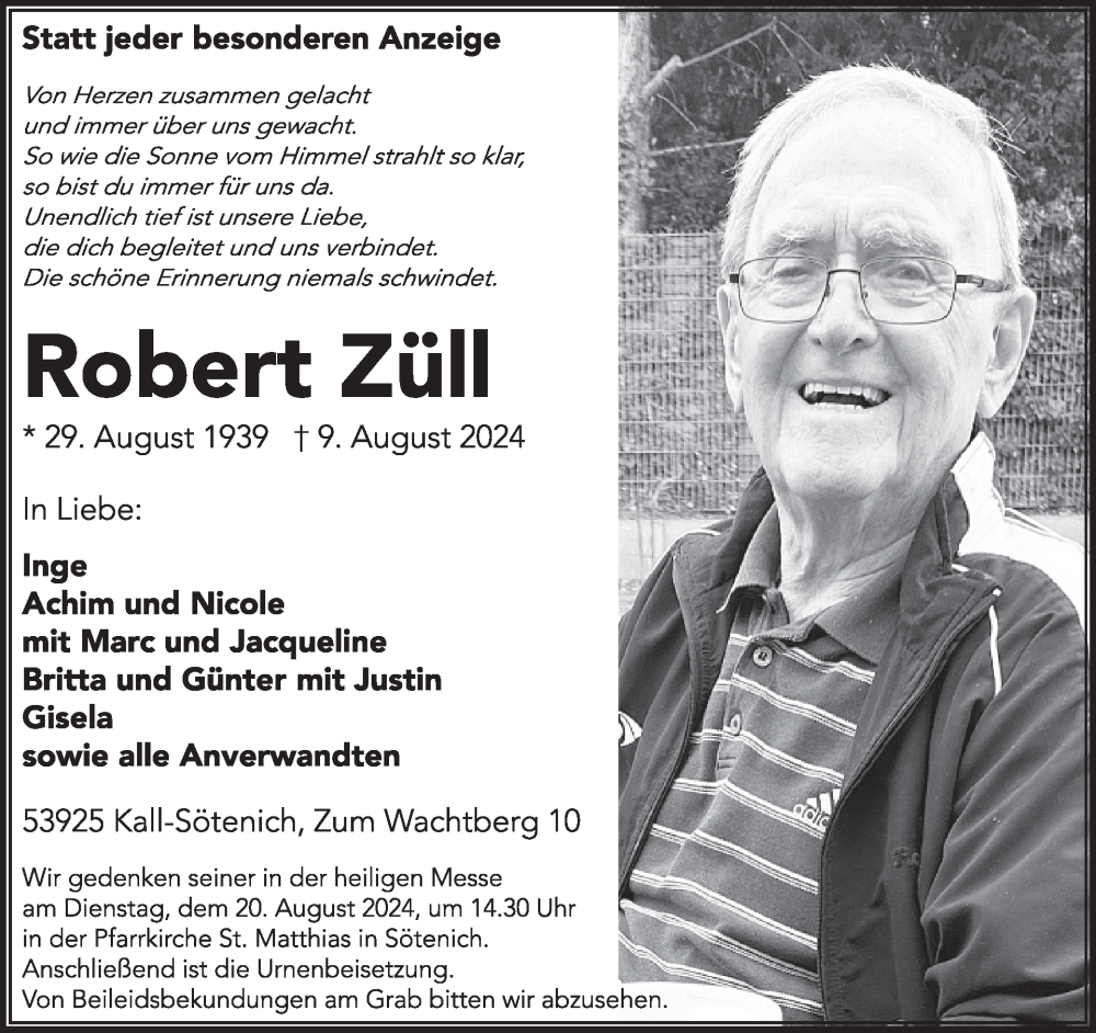 Hier finden Sie alle Traueranzeigen aus der Zeitung, die bisher für Robert Züll erschienen sind. Weitere Traueranzeigen, die in der Zeitung erscheinen, werden hier ebenfalls aufgelistet