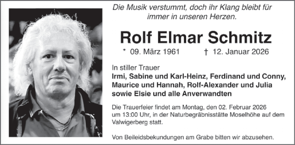Hier finden Sie alle Traueranzeigen aus der Zeitung, die bisher für Rolf Elmar Schmitz erschienen sind. Weitere Traueranzeigen, die in der Zeitung erscheinen, werden hier ebenfalls aufgelistet
