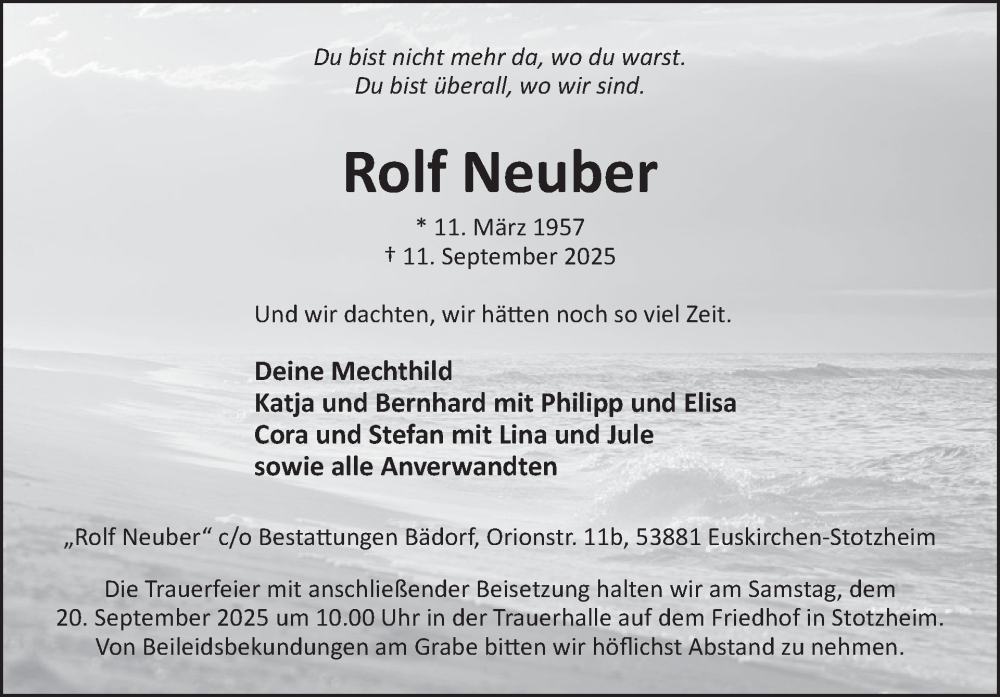 Hier finden Sie alle Traueranzeigen aus der Zeitung, die bisher für Rolf Neuber erschienen sind. Weitere Traueranzeigen, die in der Zeitung erscheinen, werden hier ebenfalls aufgelistet