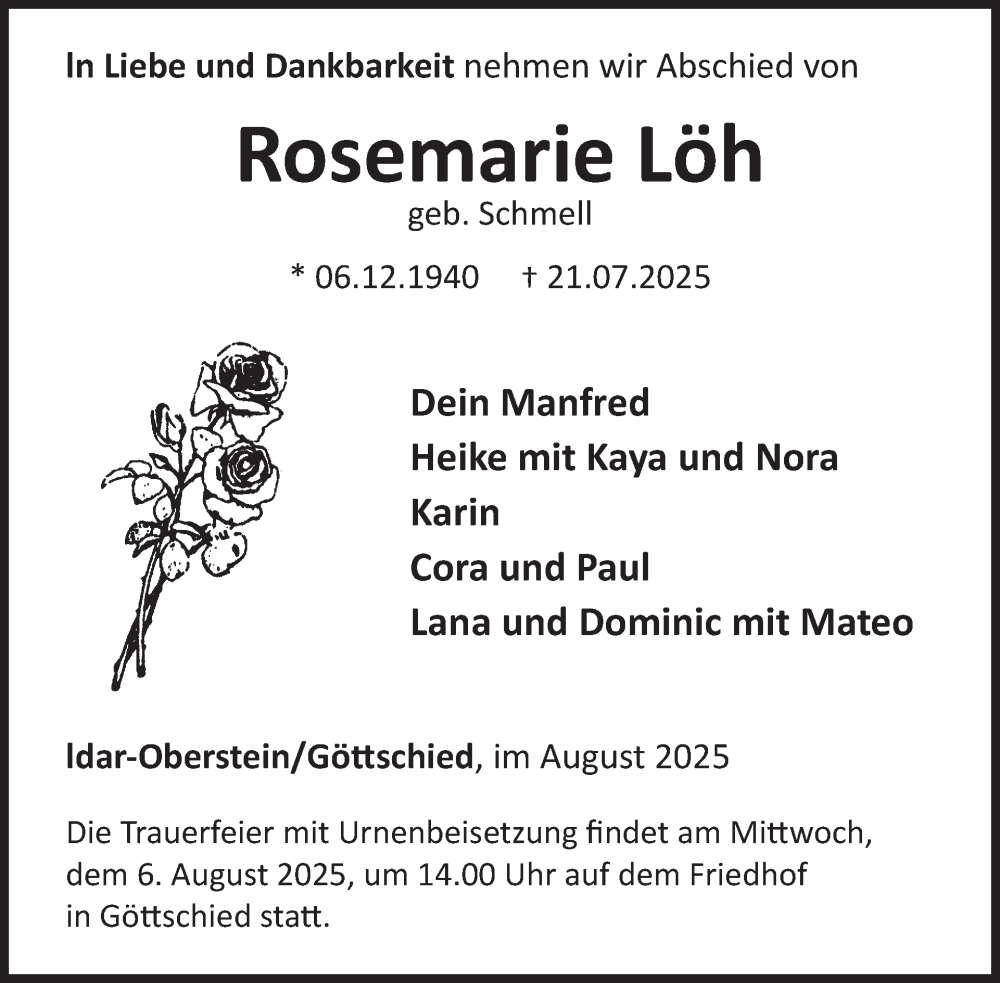 Hier finden Sie alle Traueranzeigen aus der Zeitung, die bisher für Rosemarie Löh erschienen sind. Weitere Traueranzeigen, die in der Zeitung erscheinen, werden hier ebenfalls aufgelistet