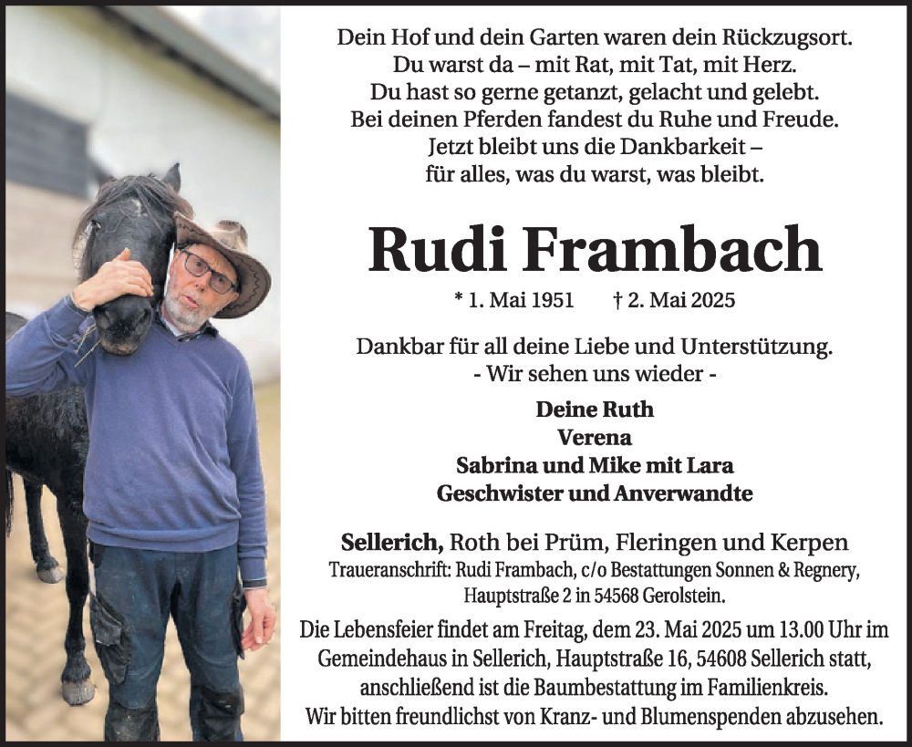 Hier finden Sie alle Traueranzeigen aus der Zeitung, die bisher für Rudi Frambach erschienen sind. Weitere Traueranzeigen, die in der Zeitung erscheinen, werden hier ebenfalls aufgelistet