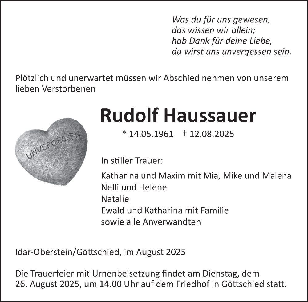 Hier finden Sie alle Traueranzeigen aus der Zeitung, die bisher für Rudolf Haussauer erschienen sind. Weitere Traueranzeigen, die in der Zeitung erscheinen, werden hier ebenfalls aufgelistet