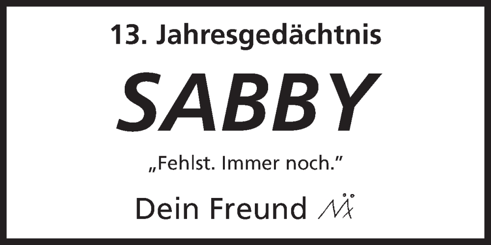 Hier finden Sie alle Traueranzeigen aus der Zeitung, die bisher für Sabby erschienen sind. Weitere Traueranzeigen, die in der Zeitung erscheinen, werden hier ebenfalls aufgelistet